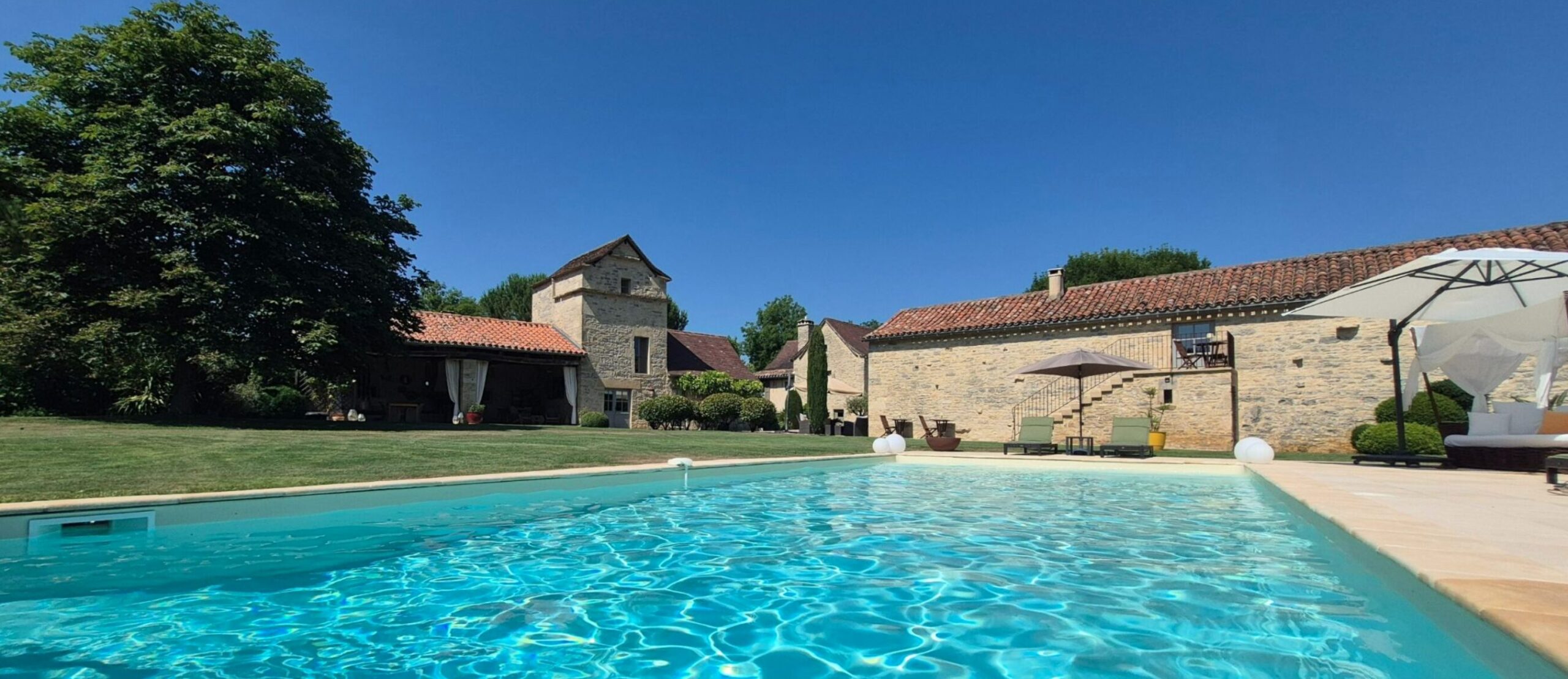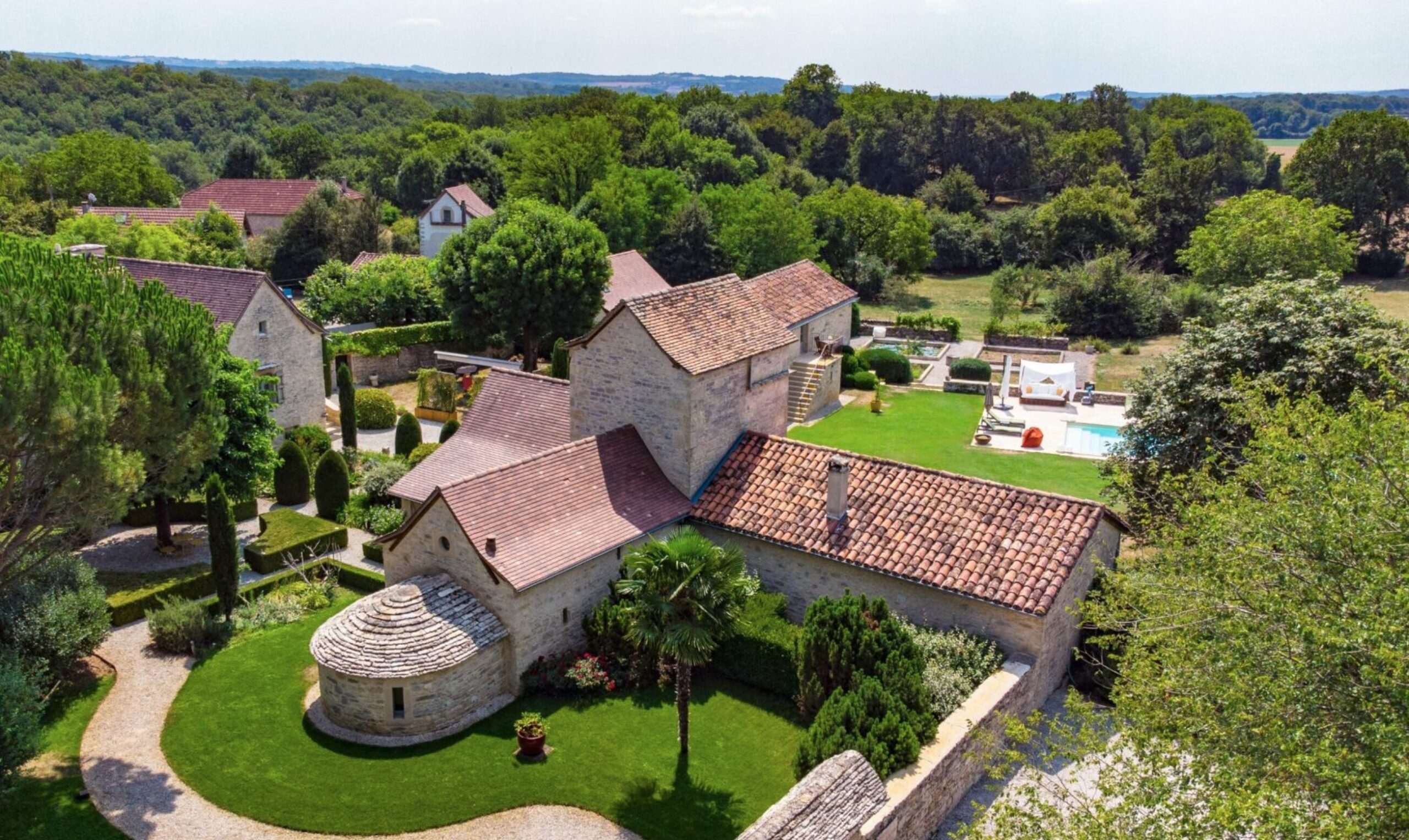 Just a stone’s throw from the Causses du Quercy Regional Nature Park, this beautifully restored farm house for sale in Tarn et Garonne offers 2 hectares of landscaped and wooded grounds — complete with a forest, natural spring, vegetable garden, French formal garden, parking, two pools, a carport, and garage.